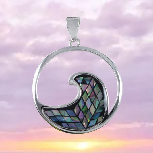 Unique Hawaiian Genuine Paua Shell Ocean Wave Necklace, Sterling Silver Ocean Wave Pendant, N8844 Birthday Valentine Wife Mom Gift