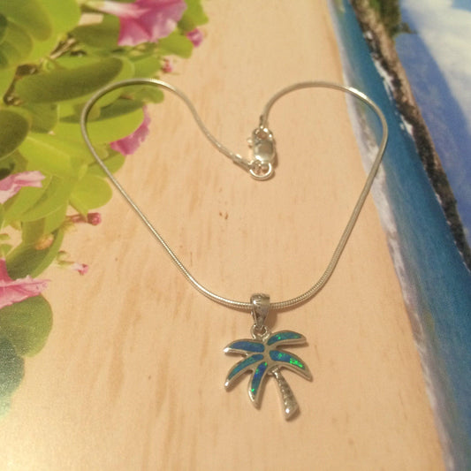 Hawaiian Blue Opal Palm Tree Pendant Necklace in Sterling Silver, N9492 - Hawaii Treasures Shop