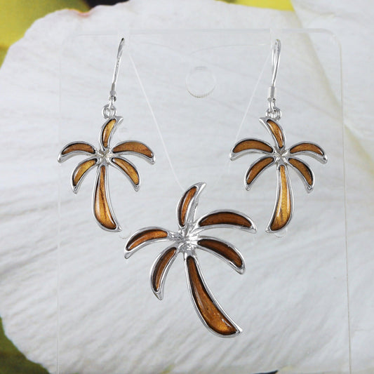Gorgeous Hawaiian Large Genuine Koa Wood Palm Tree Earring and Necklace, Sterling Silver Koa Wood Palm Tree Pendant, N8860SH Birthday Gift