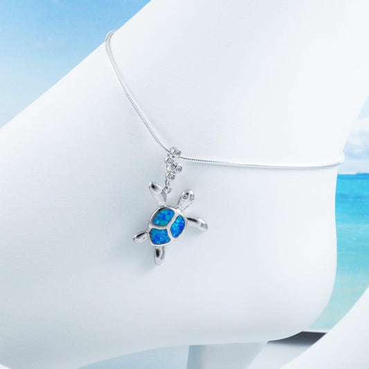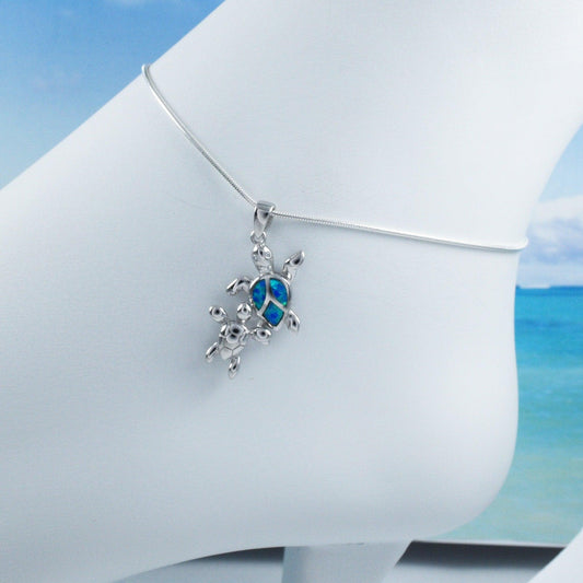 Magnifique bracelet de cheville ou bracelet en forme de tortue de mer hawaïenne en opale bleue, bracelet à breloques en argent sterling avec opale bleue, cadeau d'anniversaire pour maman A2027