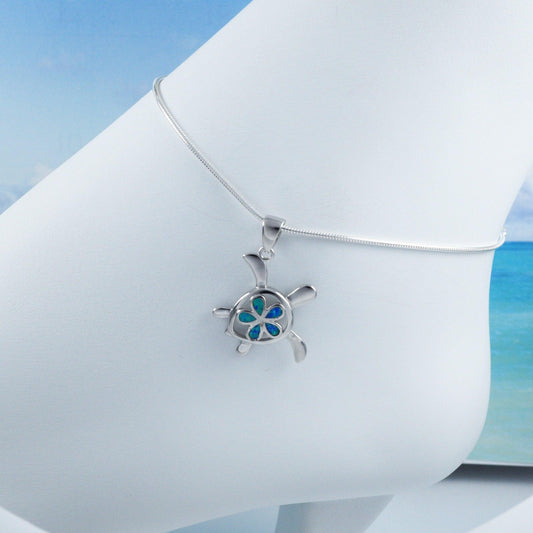 Bracelet de cheville ou bracelet unique et magnifique en forme de tortue de mer hawaïenne en opale bleue, bracelet à breloques en forme de tortue en argent sterling en opale et en plumeria, A6159