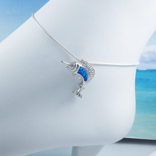 Bracelet de cheville ou bracelet unique en forme de poisson marlin en opale bleue hawaïenne, bracelet à breloques en argent sterling avec opale et espadon, cadeau d'anniversaire pour maman A6161
