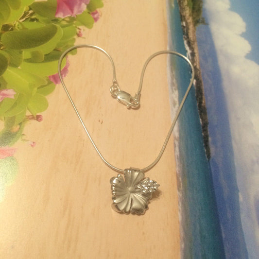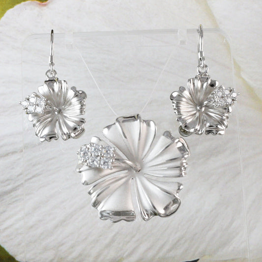 Magnifique grand collier et boucles d'oreilles hibiscus hawaïen, fleur officielle de l'État d'Hawaï, pendentif hibiscus CZ en argent sterling N6135S Cadeau maman