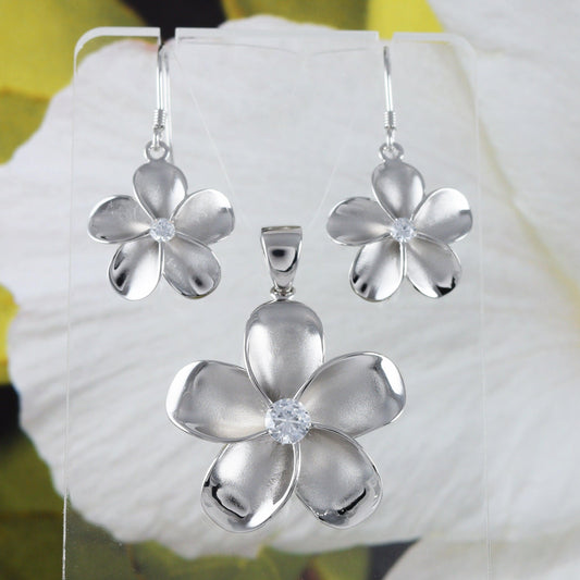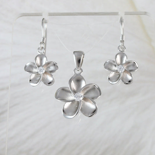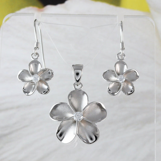 Collier et boucles d'oreilles Plumeria hawaïennes, ensemble assorti en argent sterling avec fleur de Plumeria CZ, cadeau d'anniversaire pour maman, Saint-Valentin, bijoux des îles N2031B