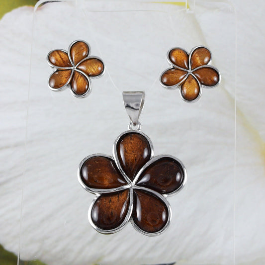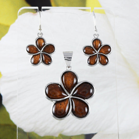 Boucles d'oreilles et collier uniques en véritable bois de koa hawaïen Plumeria, pendentif en argent sterling avec fleur de Plumeria, cadeau d'anniversaire pour mère N8511S
