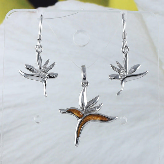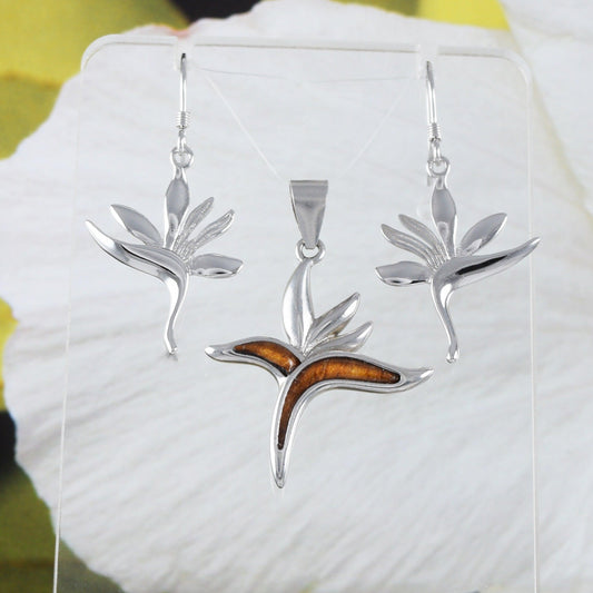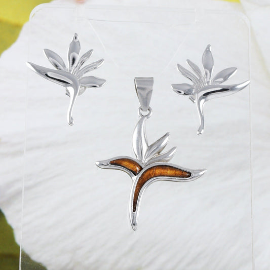 Boucles d'oreilles et collier uniques en bois de koa véritable hawaïen avec oiseau de paradis, pendentif en argent sterling avec oiseau de paradis, cadeau d'anniversaire pour maman N9314S1