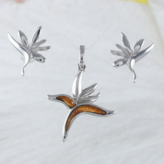 Boucles d'oreilles et collier uniques en bois de koa véritable hawaïen avec oiseau de paradis, pendentif en argent sterling avec oiseau de paradis, cadeau d'anniversaire pour maman N9314S2