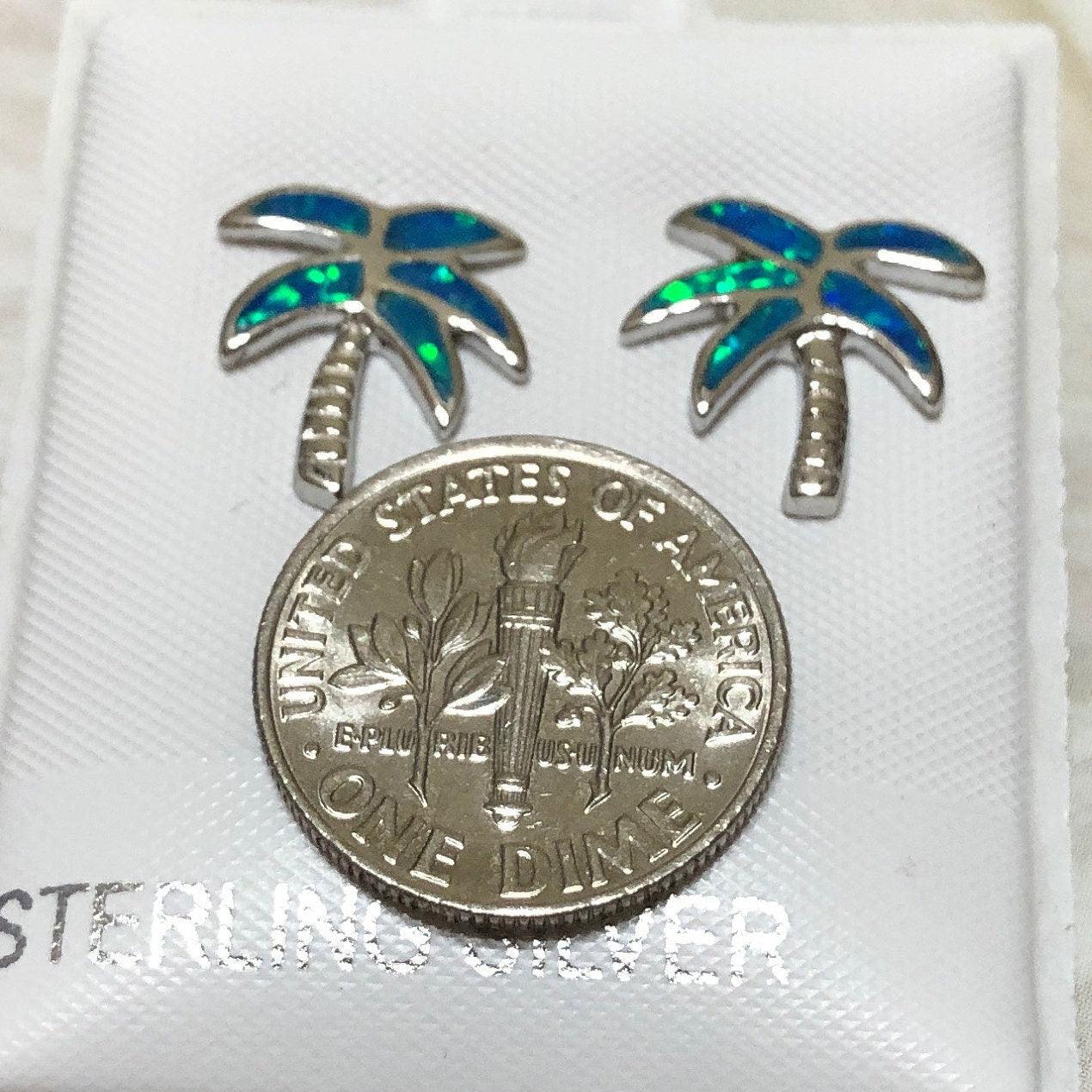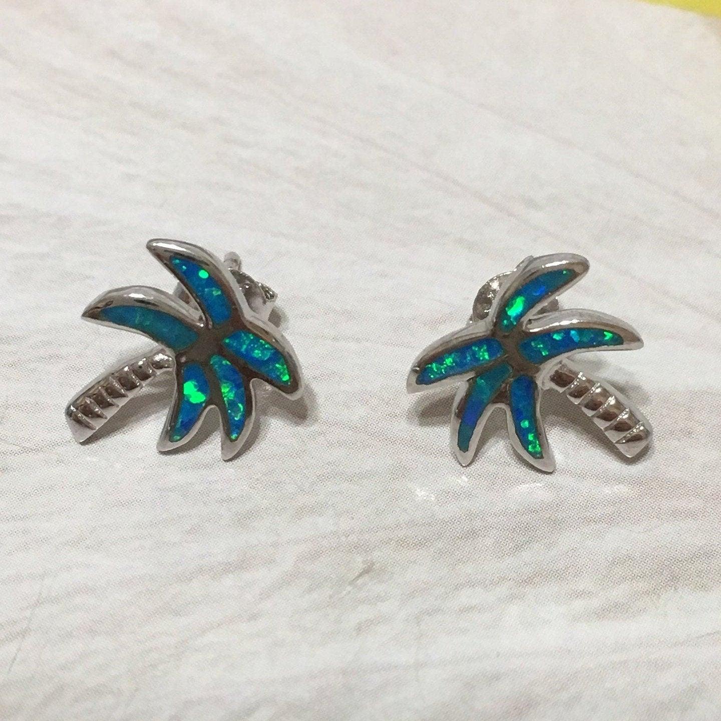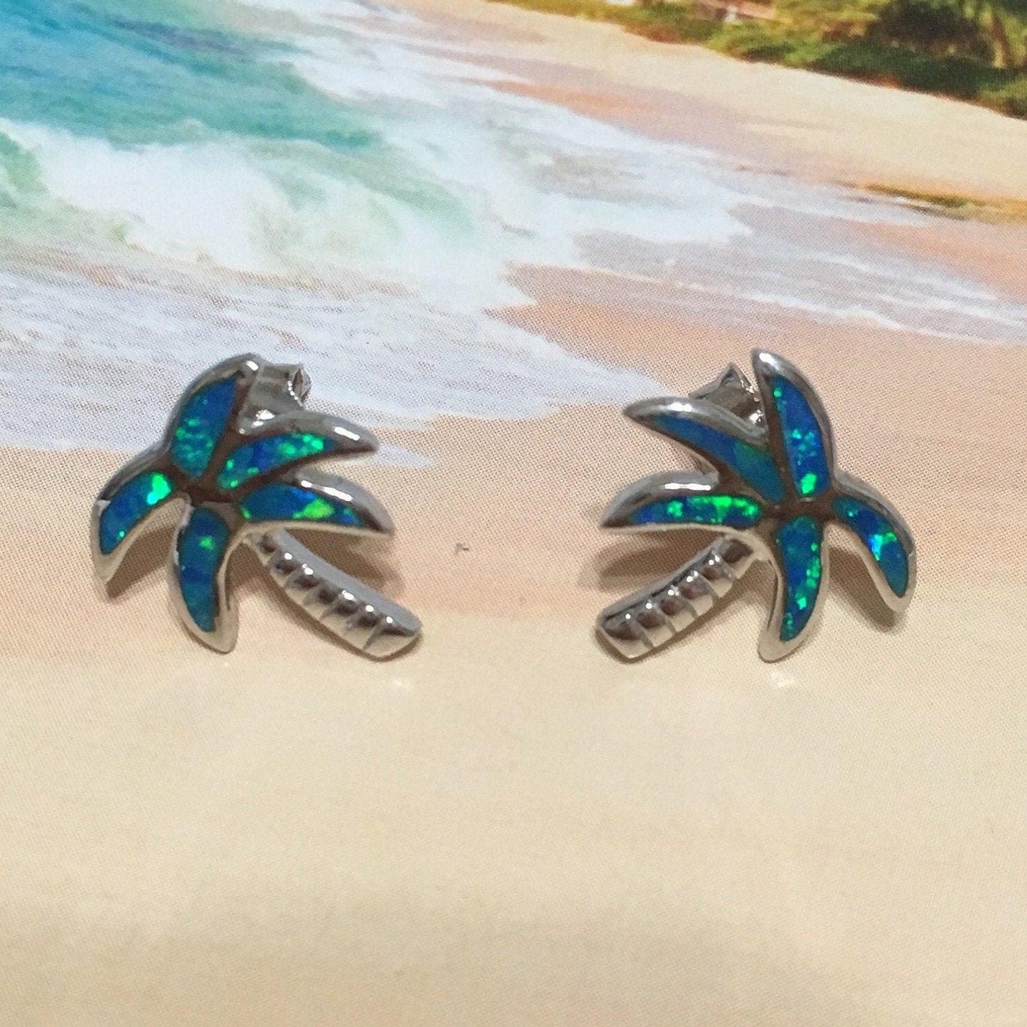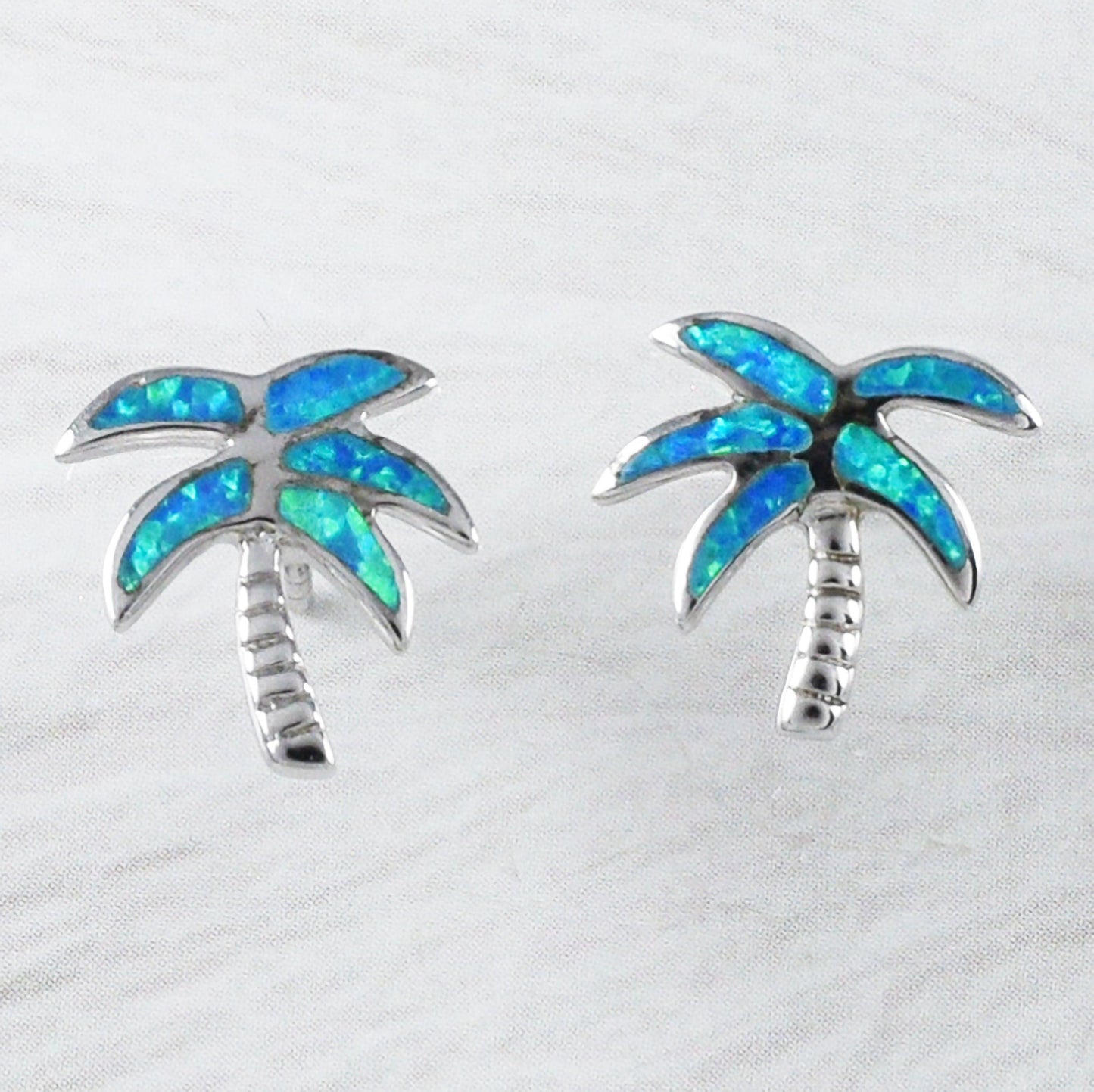 Beautiful Hawaiian Blue Opal Palm Tree Earring, Sterling Silver Blue Opal Palm Tree Stud Post Earring, E4049 Birthday Anniversary Mom Gift