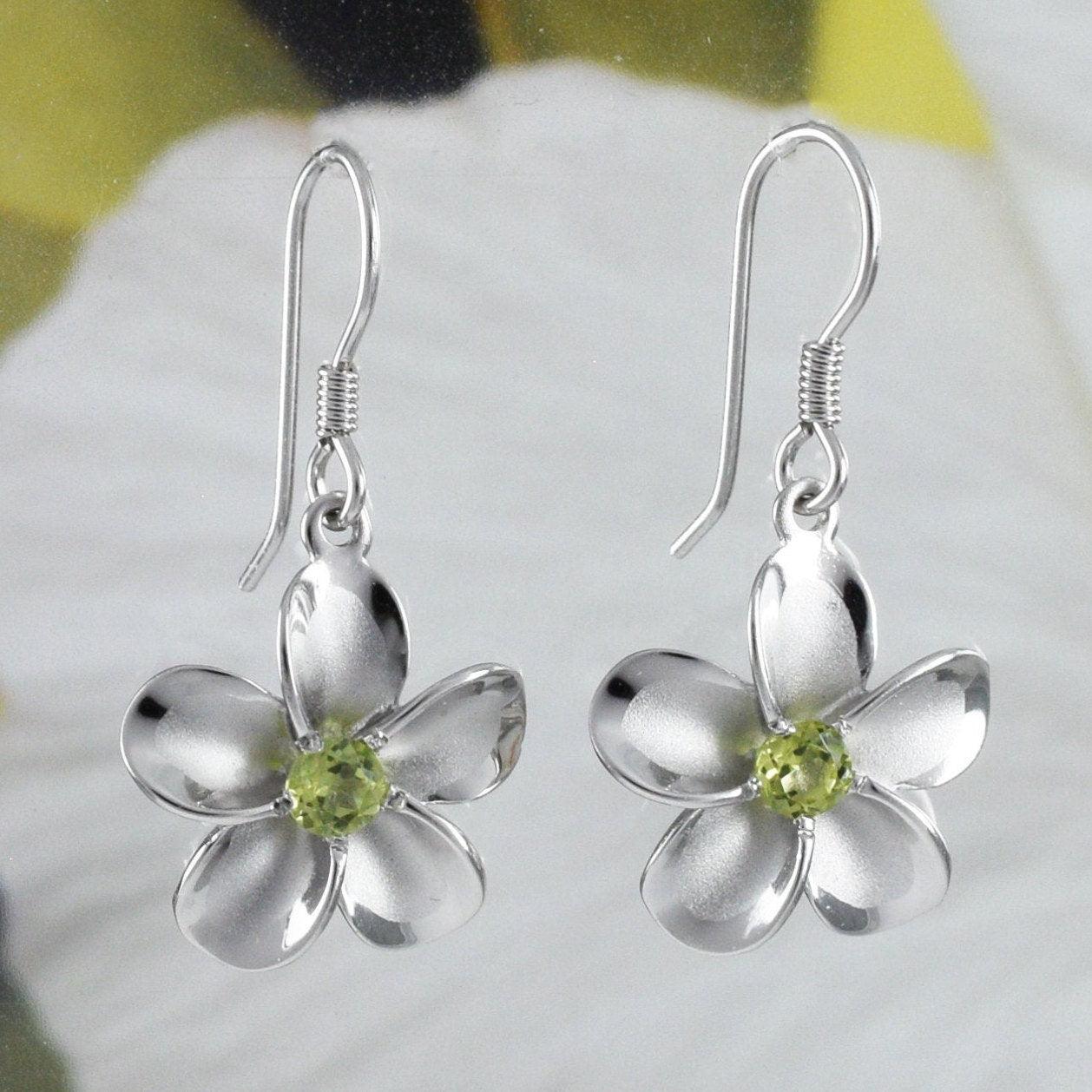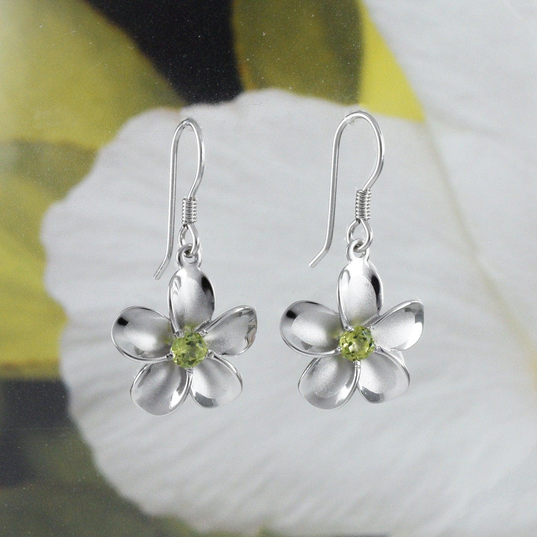 Beautiful Hawaiian Genuine Peridot Plumeria Earring, Sterling Silver Plumeria Flower Dangle Earring, E8540 Birthday Mom Mother Gift