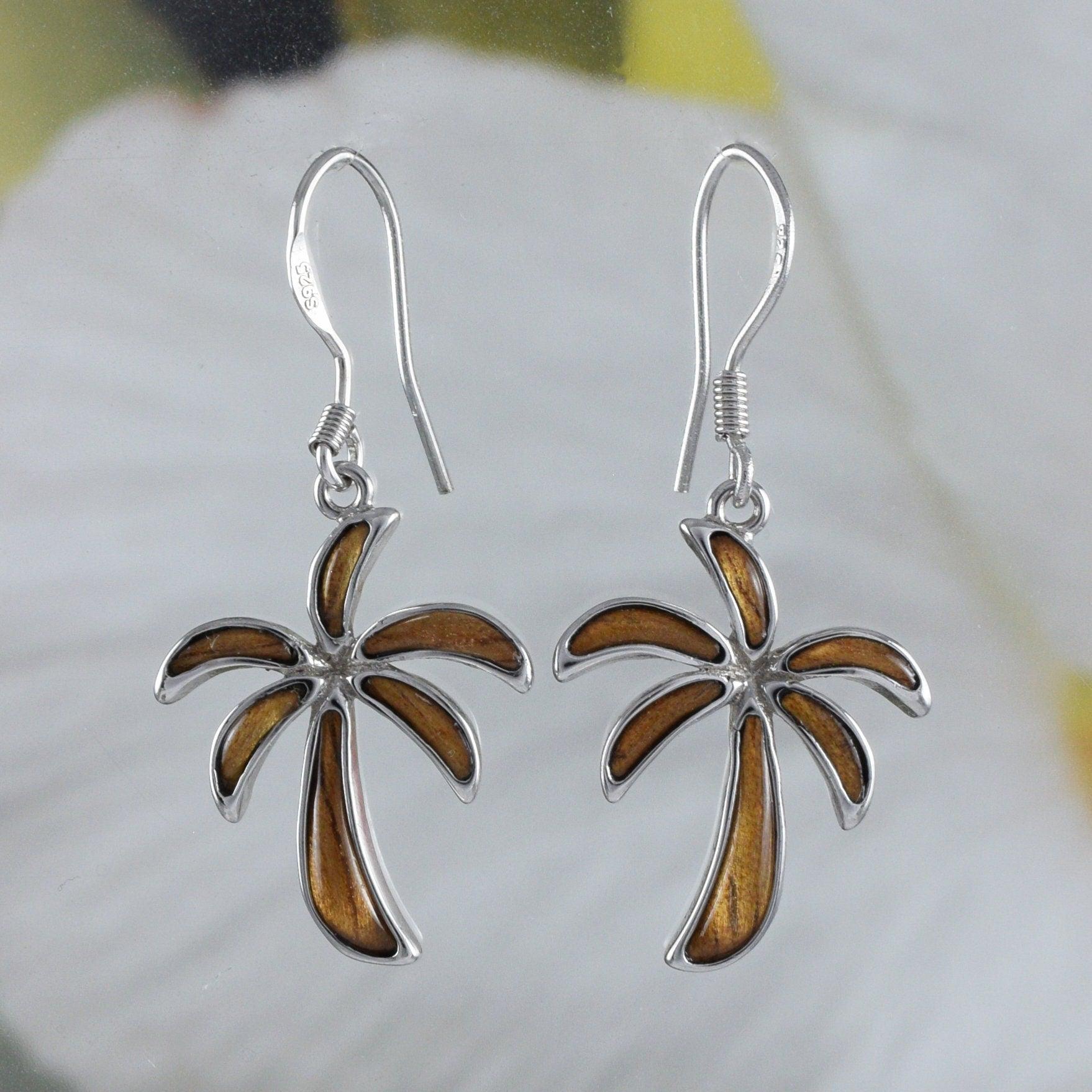 Beautiful Hawaiian Large Genuine Koa Wood Palm Tree Earring, Sterling Silver Palm Tree Dangle Earring, E8922 Birthday Mom Mother Gift