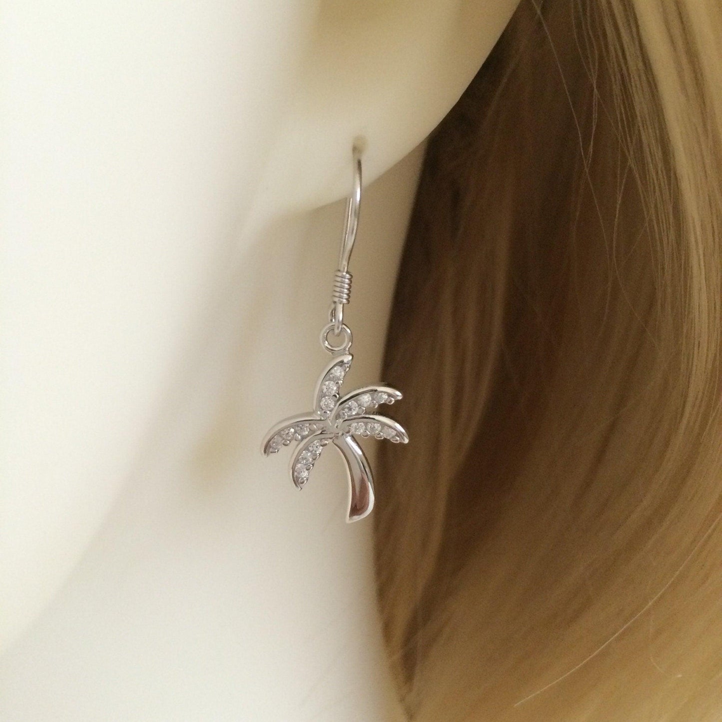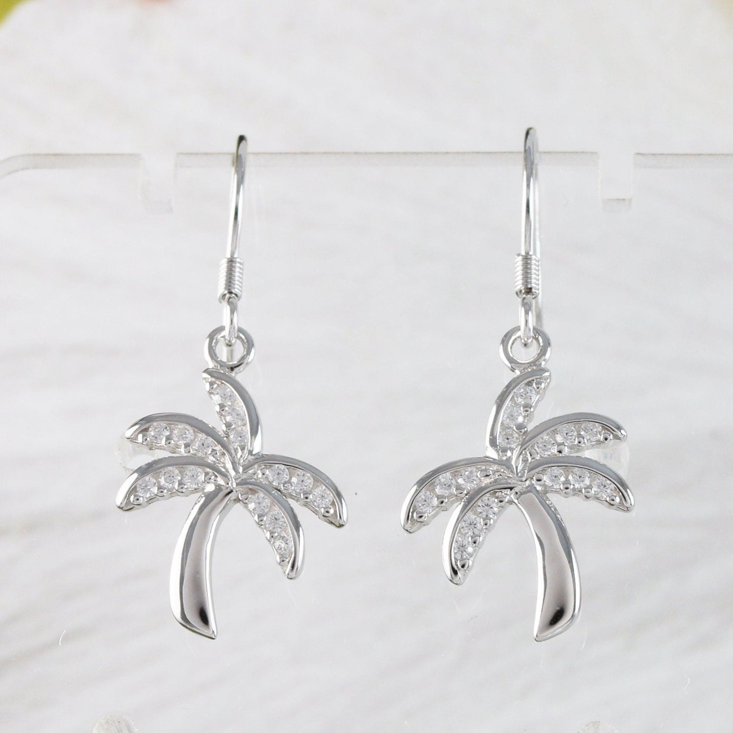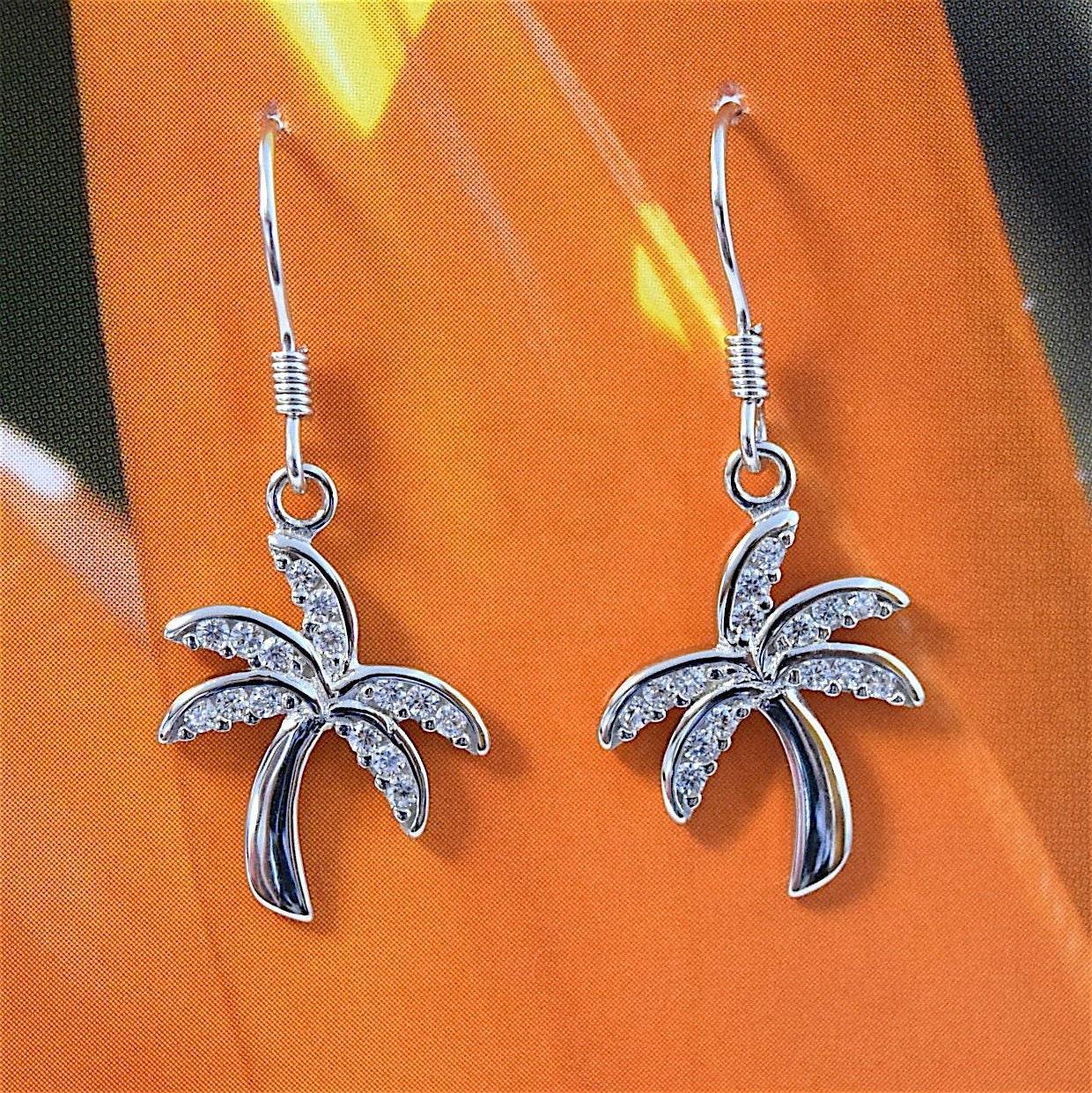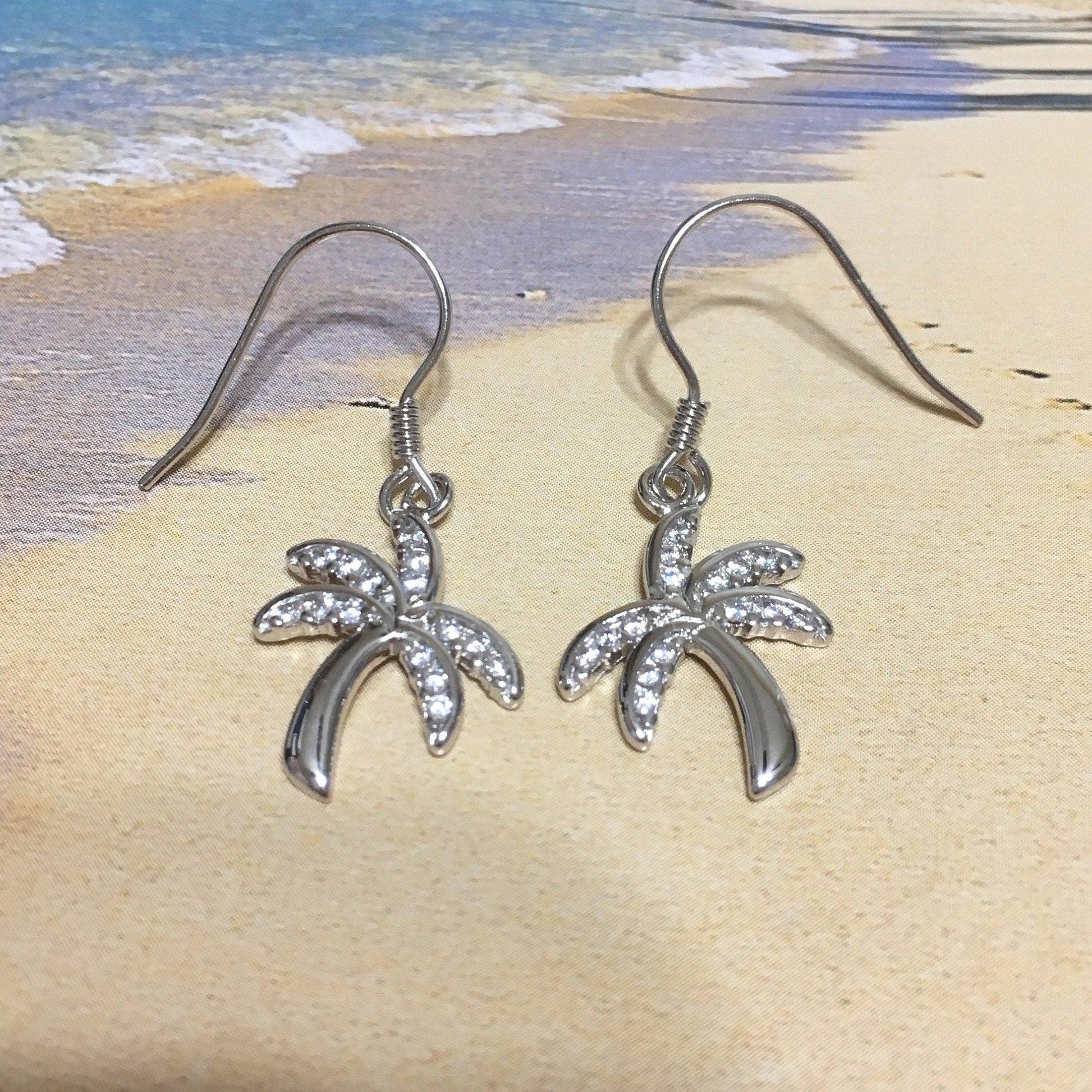 Beautiful Hawaiian Large Palm Tree Earring, Sterling Silver Palm Tree CZ Dangle Earring, E4022 Birthday Mom Mother Gift, Island Jewelry