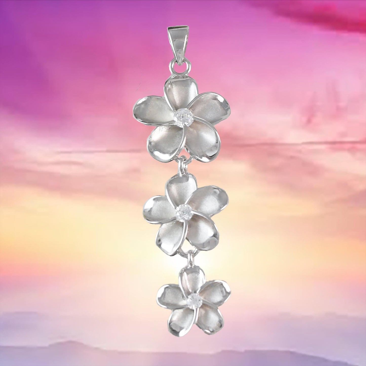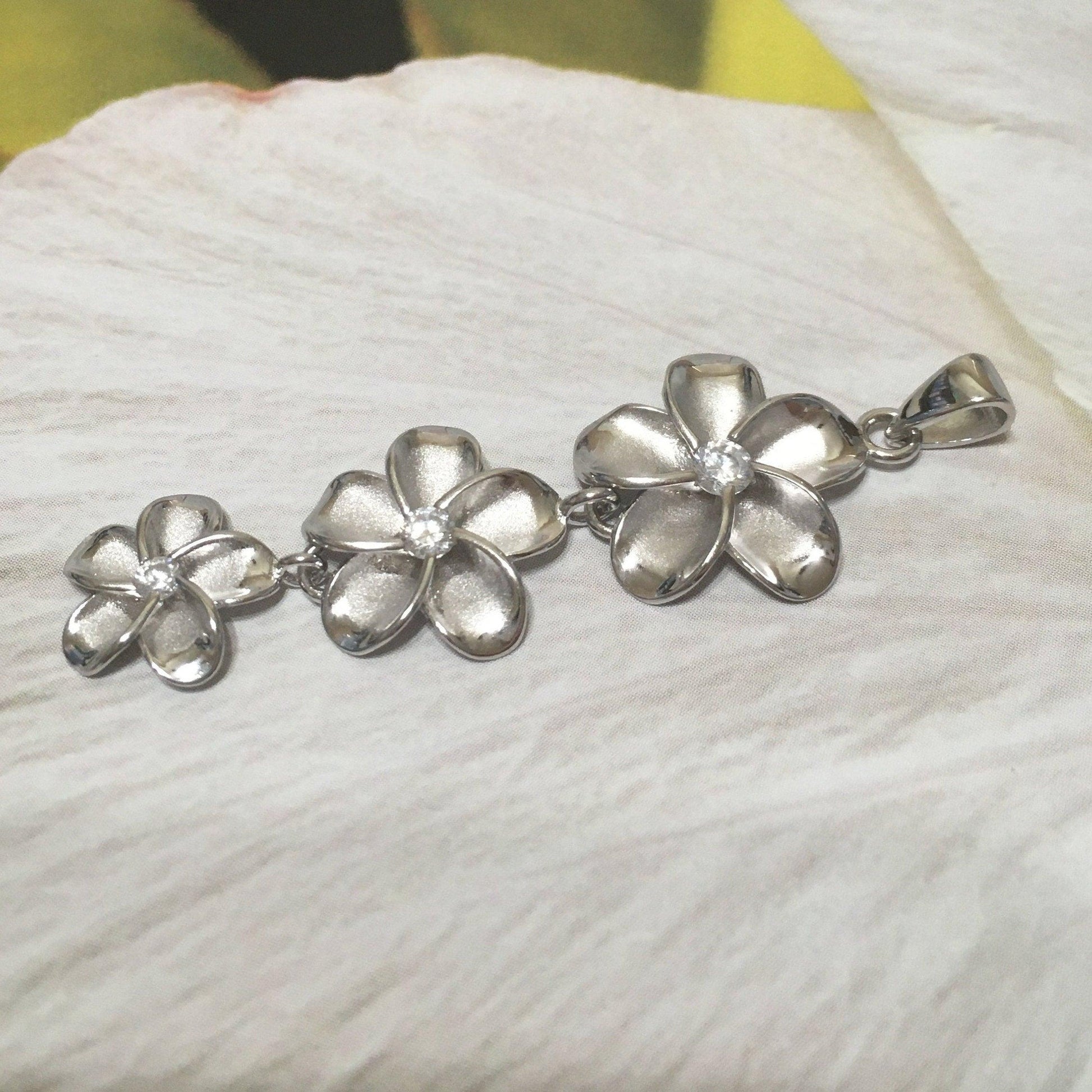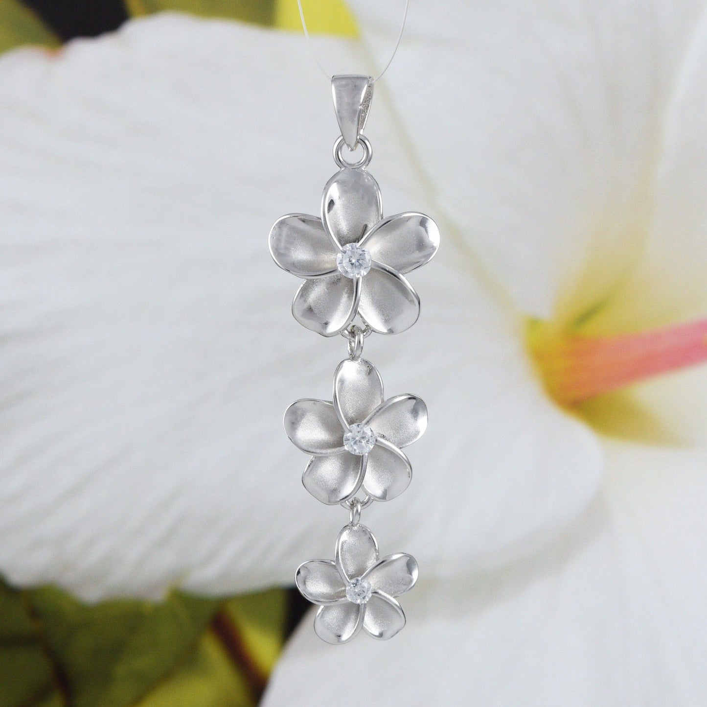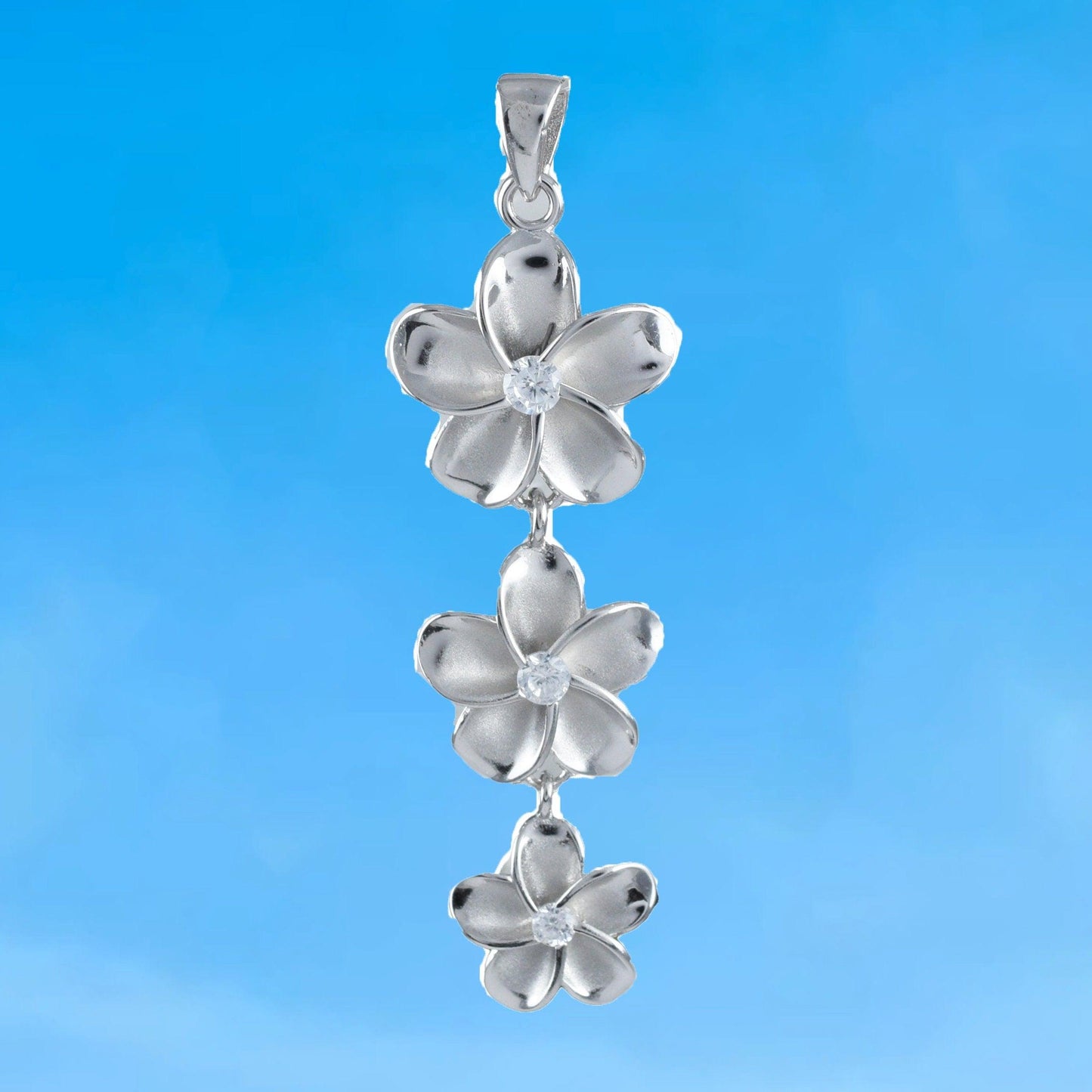 Gorgeous Hawaiian Large 3 Plumeria Necklace, Past Present & Future, Sterling Silver Plumeria Flower CZ Pendant, N6138 Birthday Mom Gift