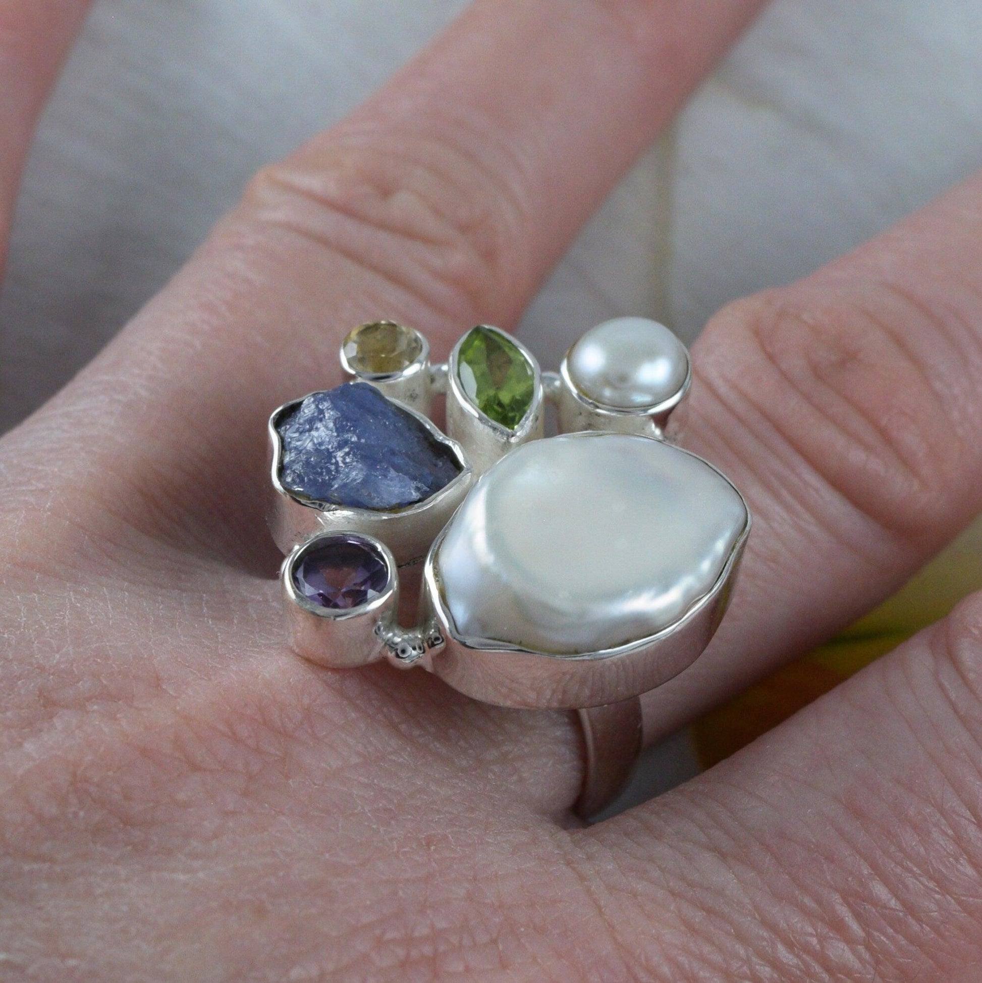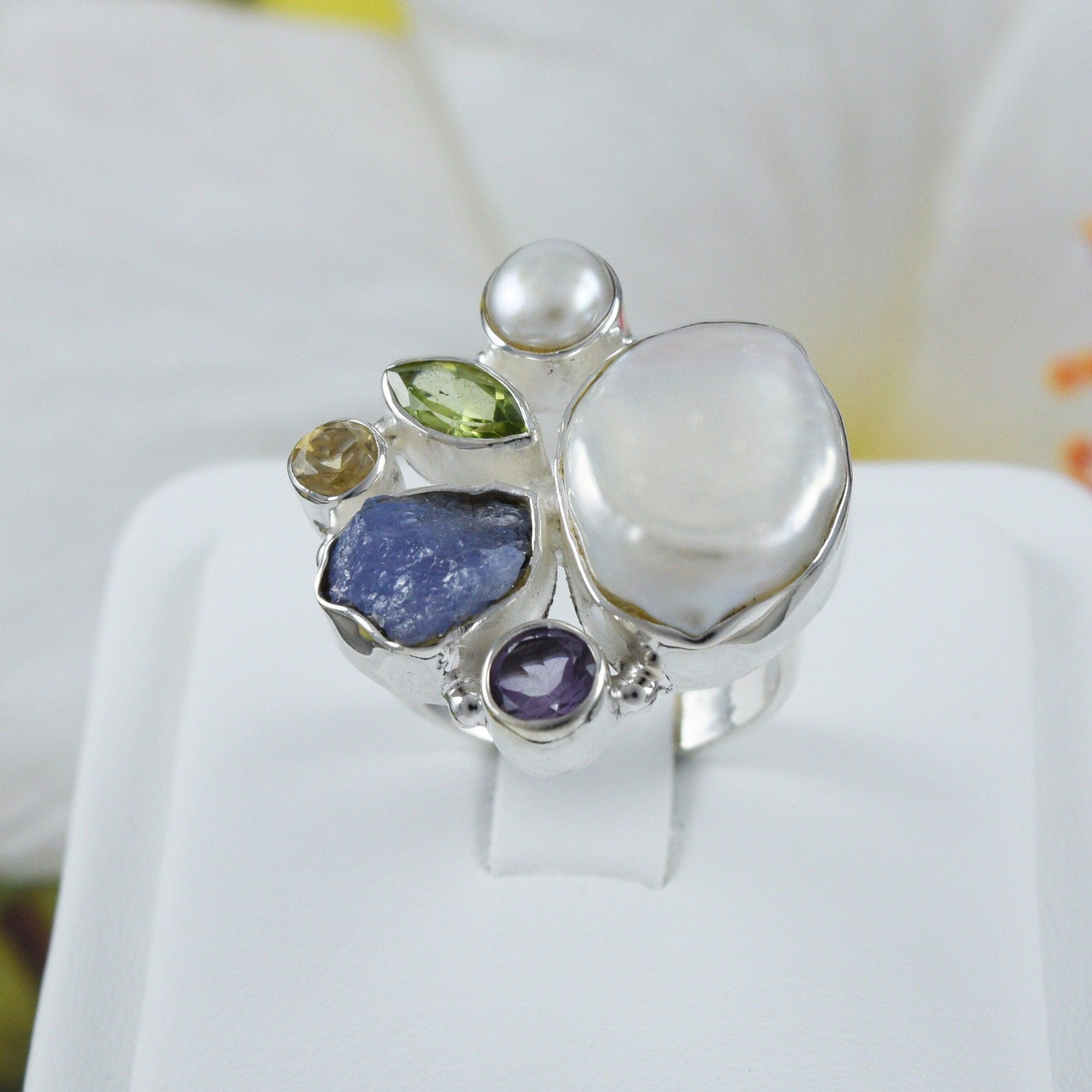 Gorgeous Hawaiian X-Large Genuine Peridot Citrine Amethyst Blue Topaz White Pearl Ring, Sterling Silver Ring, R2605 Statement PC