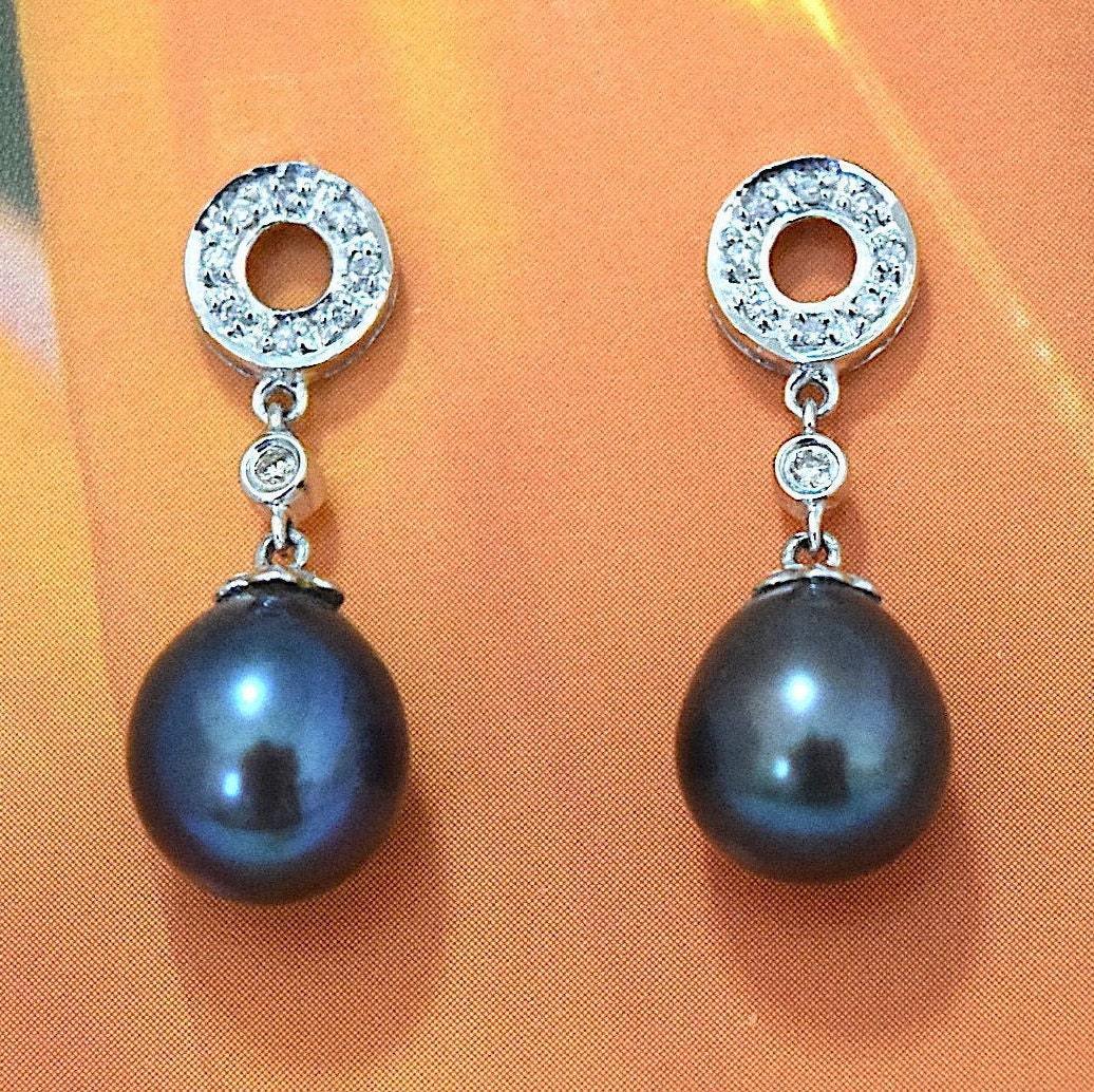 Stunning Hawaiian Genuine Black Pearl Earring, 14KT Solid White-Gold Black Pearl Diamond Dangle Earring, E5554 Birthday Gift, Statement PC