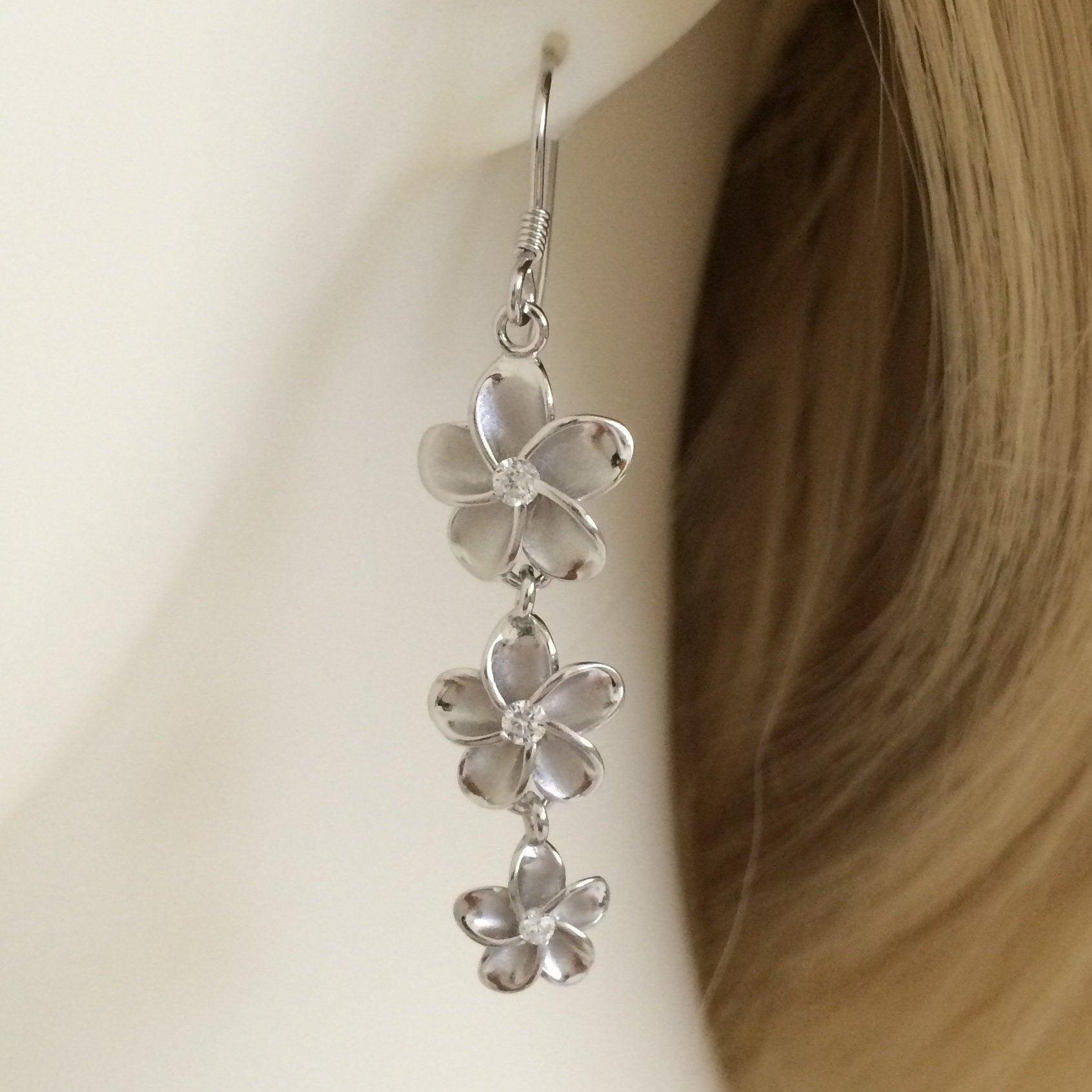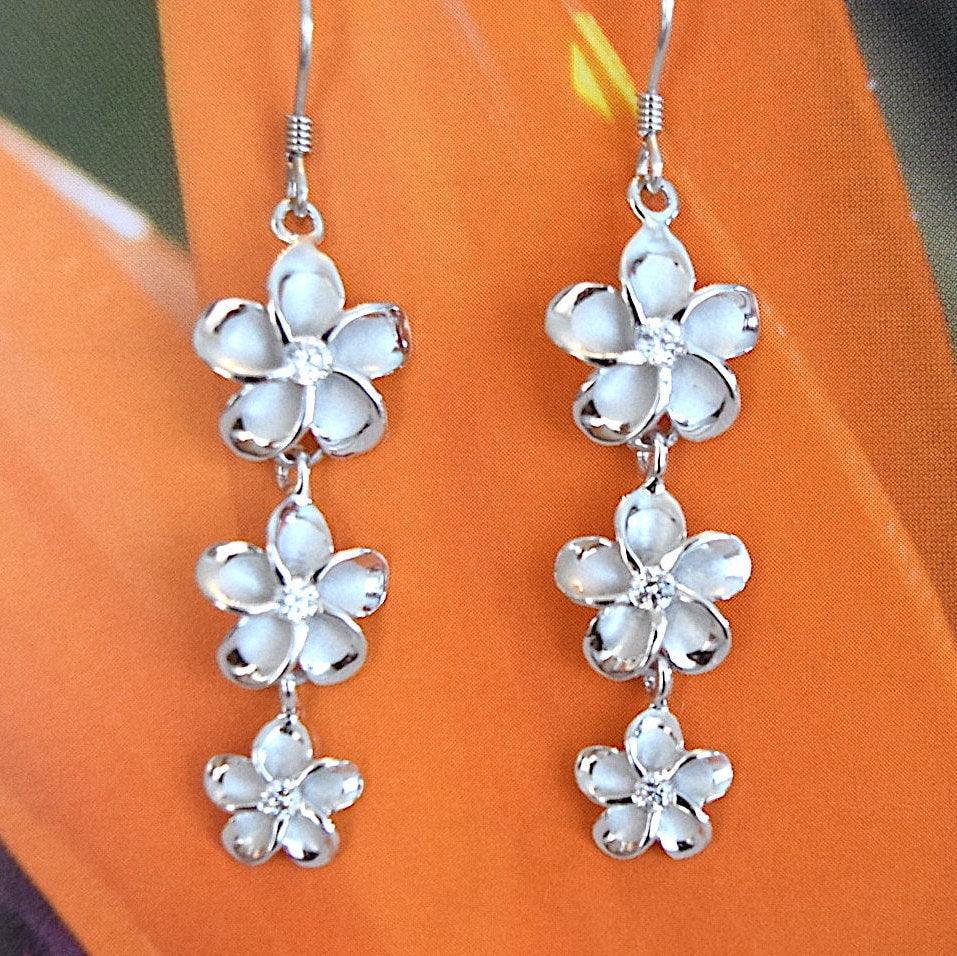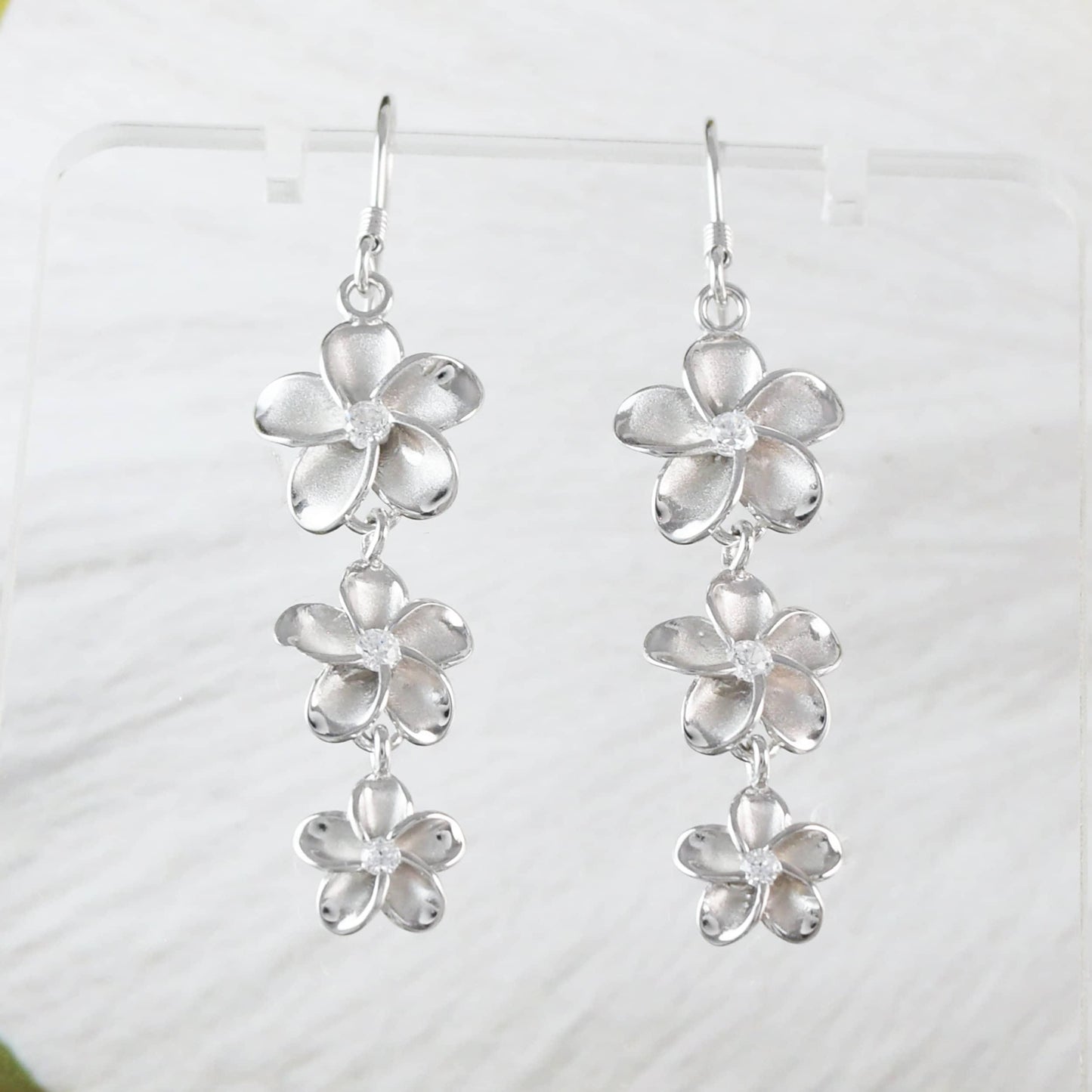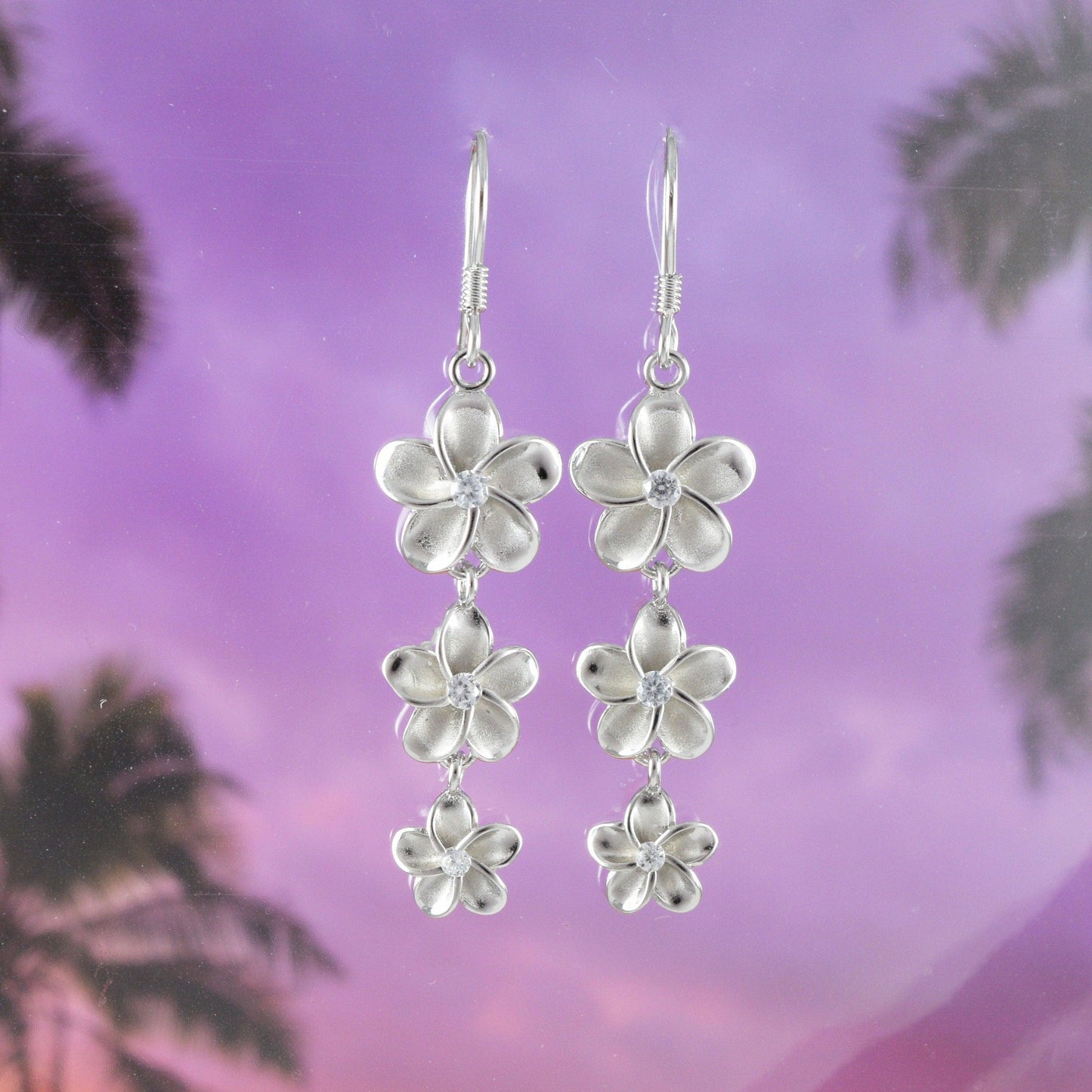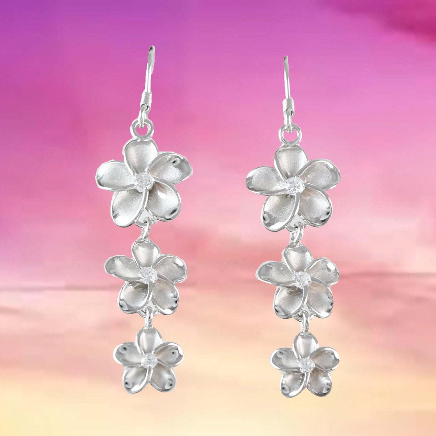 Stunning Hawaiian Large 3 Plumeria Earring, Past Present & Future, Sterling Silver 3 Plumeria Flower CZ Dangle Earring E4128 Birthday Gift