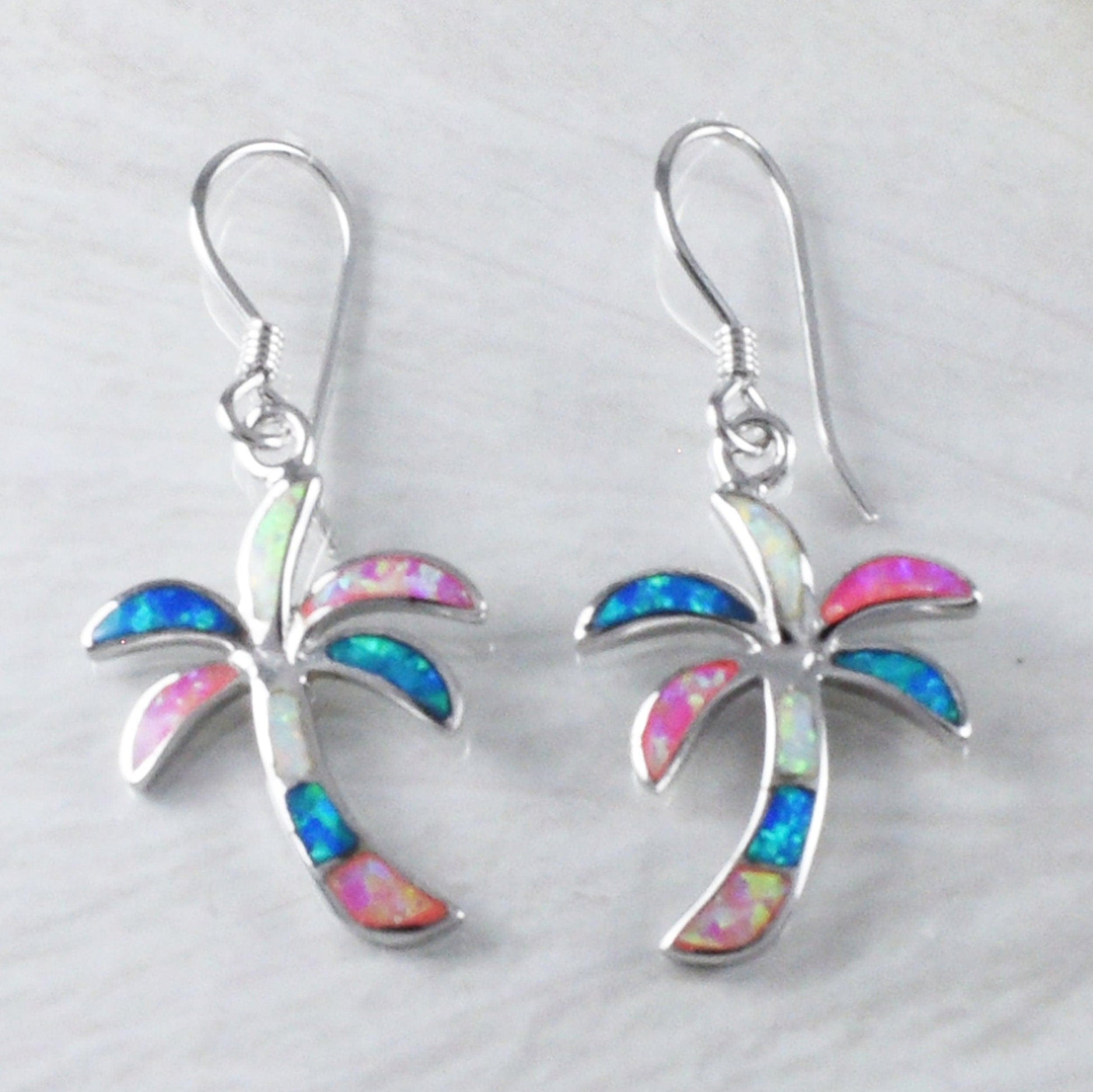 Unique Beautiful Hawaiian Large Tri-color Opal Palm Tree Earring, Sterling Silver Blue White Pink Opal Palm Tree Dangle Earring, E9283