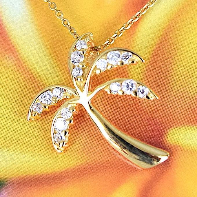 Unique Beautiful Hawaiian Palm Tree Necklace, Sterling Silver Yellow-Gold Plated Palm Tree CZ Pendant, N6057 Birthday Mom Mother Gift