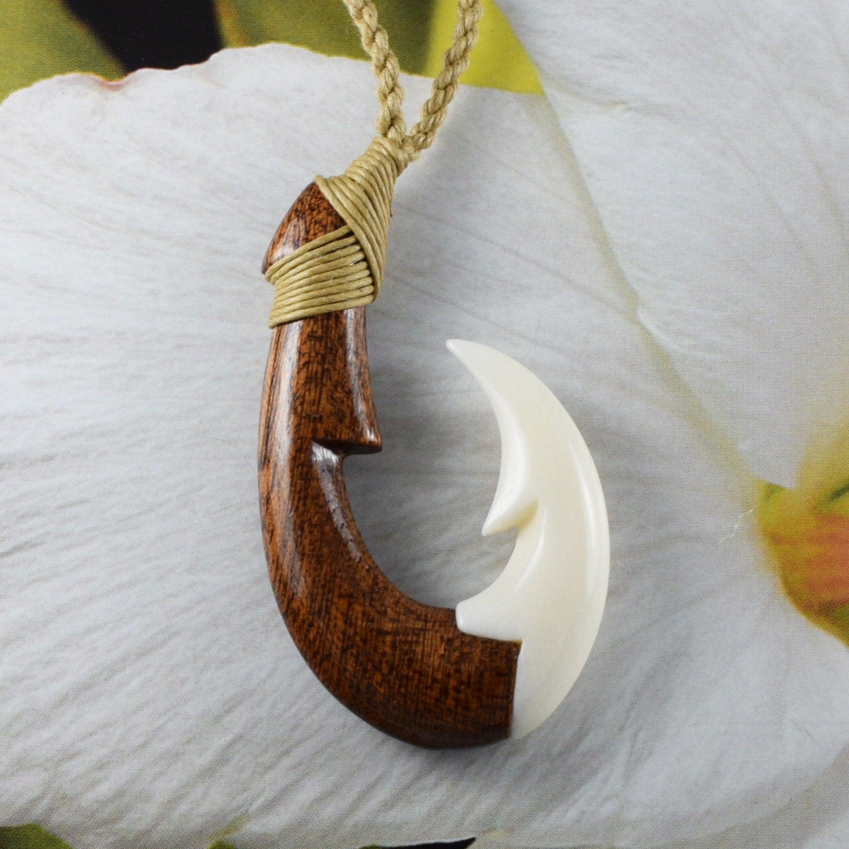 Unique Hawaiian Large Genuine Koa Wood Fish Hook Necklace, Hand Carved Buffalo Bone 3D Fish Hook Necklace, N9401 Birthday Mother Gift