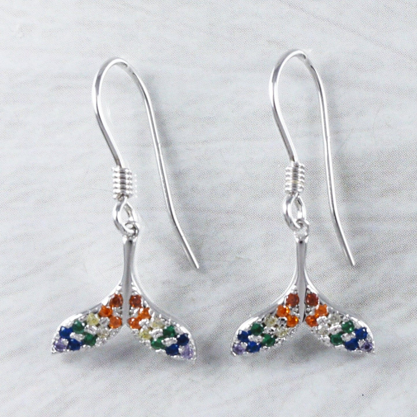 Unique Hawaiian Rainbow Whale Tail Earring and Necklace, Sterling Silver Multi-Color Stone Whale Tail Necklace, N9330S Birthday Mom Gift